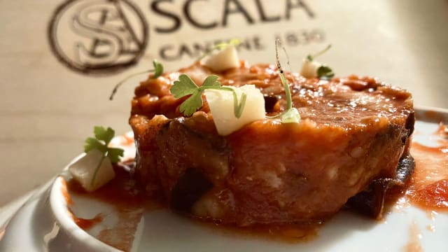 - Melanzana come scrigno ripiena di diavola alla parmigiana, gazpacho di pomodoro e basilico