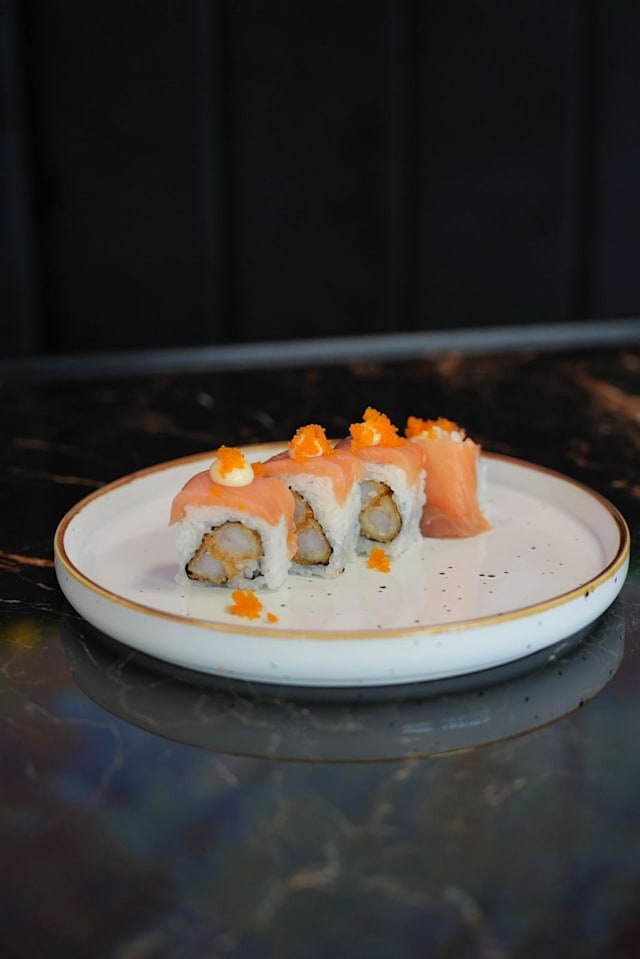 - Riso sushi, avocado, alga nori, gamberi fritti, salmone affumicato, maio, tobiko