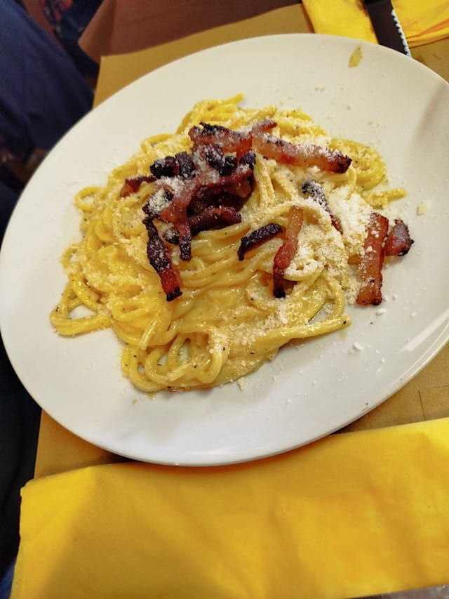Mezze maniche o rigatoni (a seconda della disponibilità),guanciale di amatrice,pecorino romano,uova allevate a terra,pepe