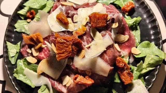 Il carpaccio di black angus affumicato al ciliegio - con rucola, pomodori confit, grana e mandorle