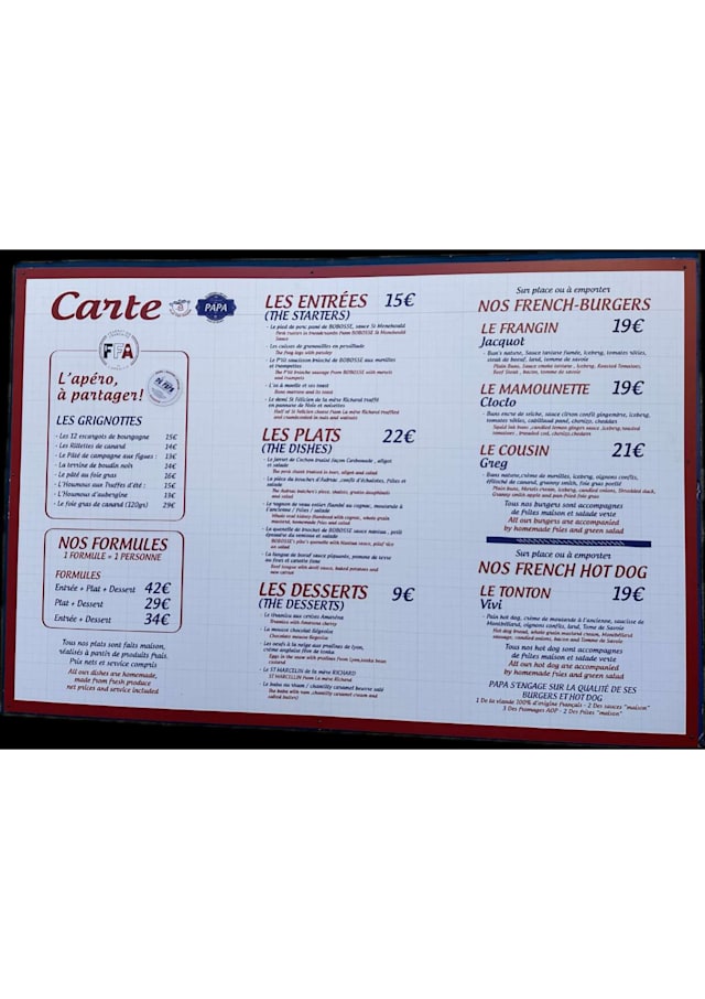 10/10Fantastic food and service. Great regional wines and food. Maybe the best meal we’ve had in France. Duck confit burger topped with foie Gras, homemade fries and salad and the floating island meringue was the best. Was fully booked so make a reservation. Service from friend of son of papa was very helpful and appreciated.