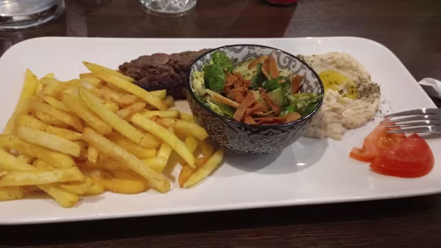- Nos assiettes sont accompagnées de taboulé ou fattouch, hommos ou moutabbal et frites