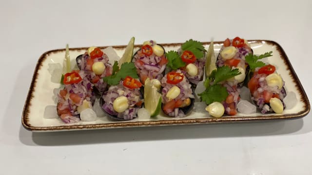 Mejillones hechos al vapor, cubiertos con chalaquita de cebolla, tomate, choclo y un suave aliño con un punto de picante.