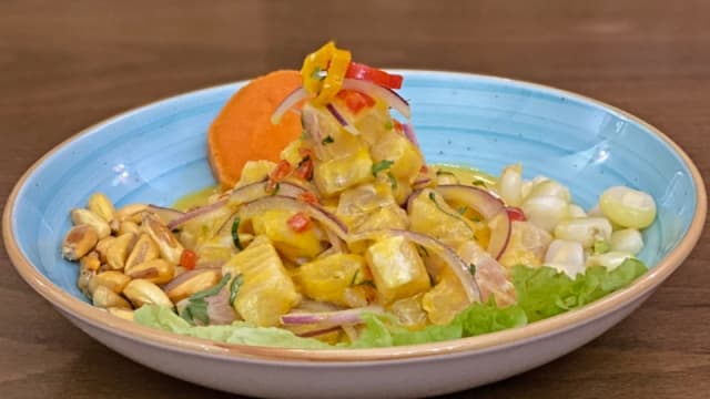 Dados de lomo de pescado y mariscos de temporada, marinados en zumo de lima, cilantro y ají limo. Acompañado de lechuga, camote, yuca, cebolla roja, choclo y canchita.