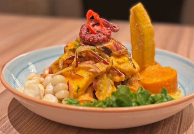 Suaves y finas laminas de pulpo marinados en una salsa acevichada especial de ají amarillo, cilantro y ají limo, acompañado de choclo, camote y canchita.
