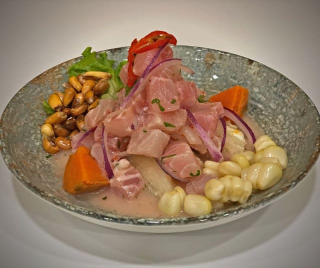 Dados de lomo de pescado, marinados en zumo de lima, cilantro y ají limo. Acompañado de lechuga, camote, yuca, cebolla roja, choclo y canchita.