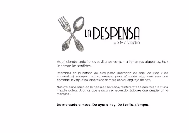 La Despensa de Molviedro - Hotel Vincci MolviedroHi Luis, thank you so much for your wonderful review! We’re delighted to hear that you enjoyed the excellent service and the quiet ambiance, something we really care about to make every visit comfortable and relaxed 😊. It’s great to know that you chose our special evening menu with 7 small dishes and drinks, and that you found it a good option to discover different flavors. We designed this experience so guests can enjoy a varied tasting of our cuisine in a single dinner in Seville. We truly appreciate your feedback and would love to welcome you back soon for another great experience!