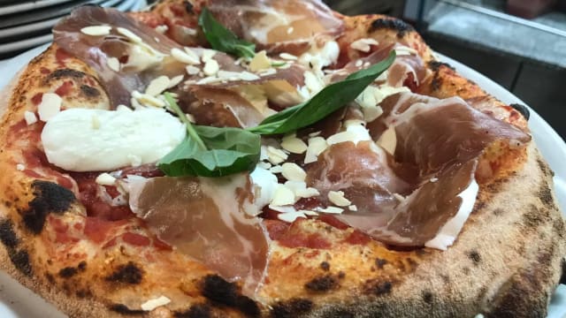 Bufalo dop pesto siallano, pomodorino, prosciutto crudo di parma, rucola e scaglie di grana