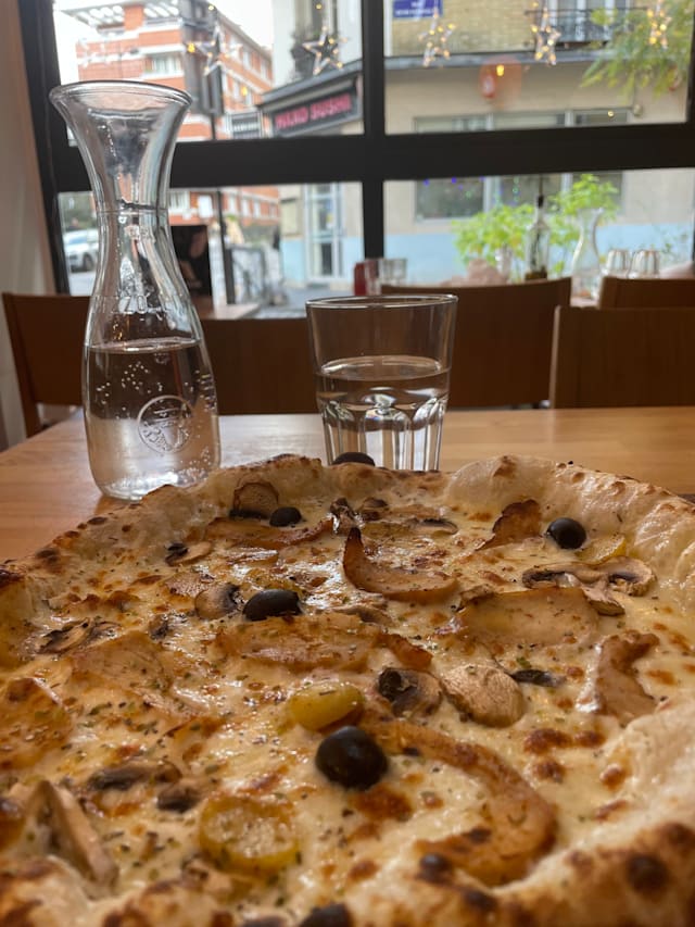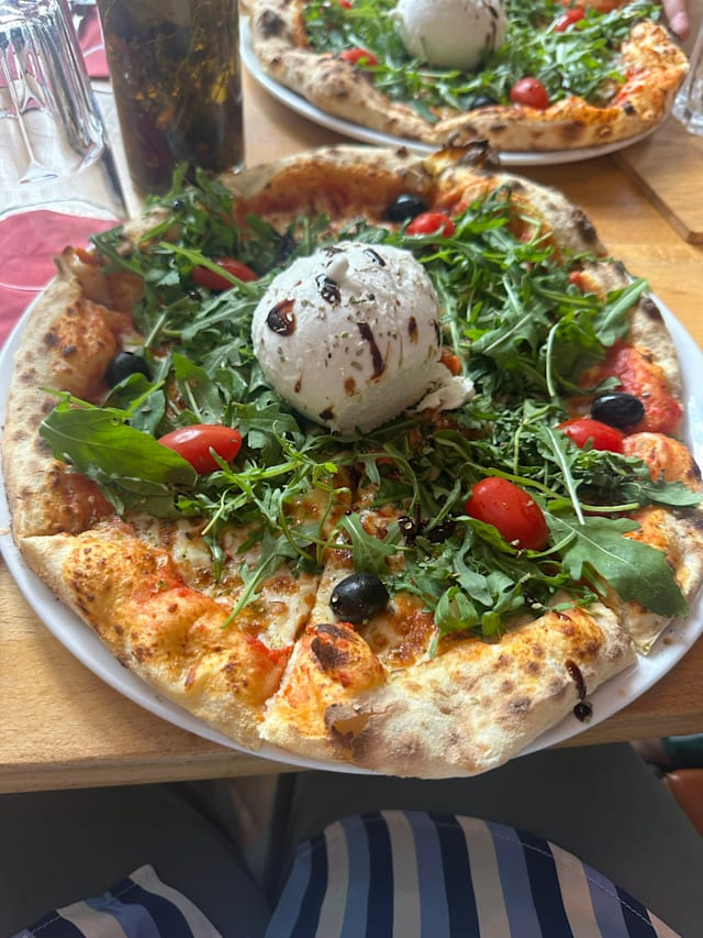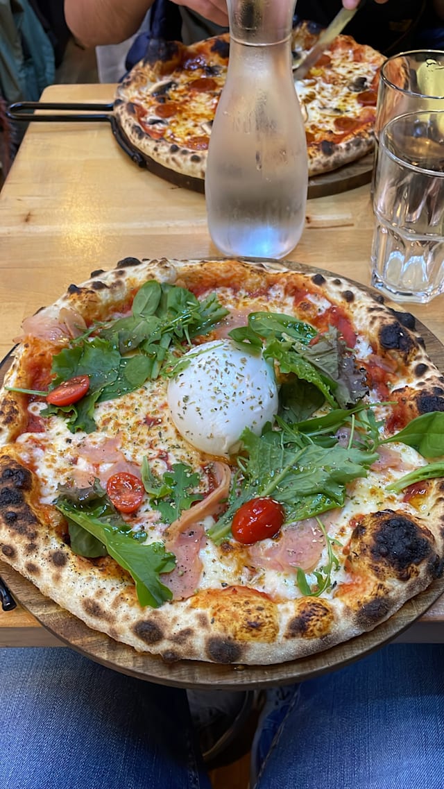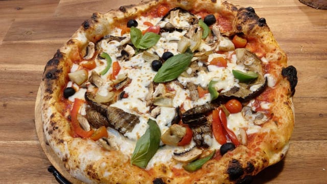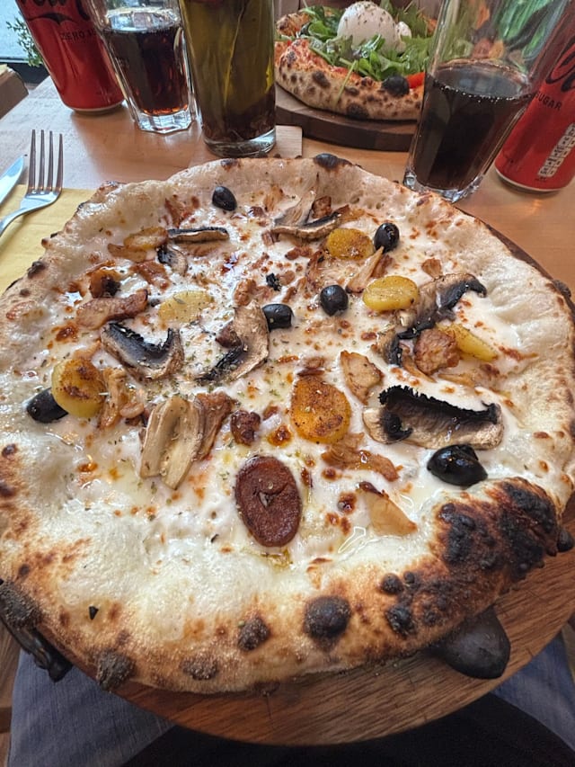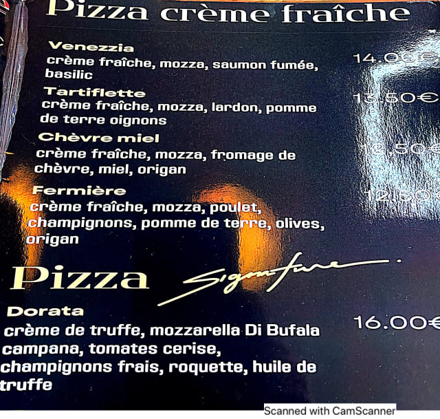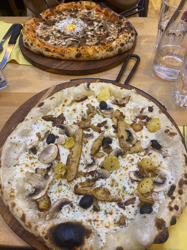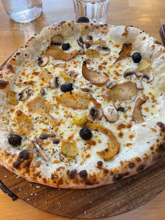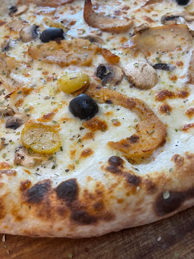 Crème de truffe, mozzarella di bufala campana, tomates cerise, champignons frais, roquette, huile de truffe