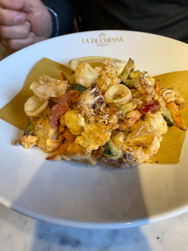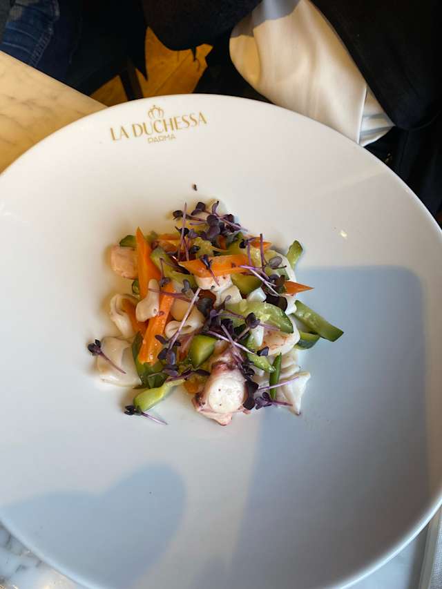 - Insalatina di mare con polpo, calamari, gamberi accompagnato con verdure cotte al forno: zucchine, carote e peperoni.