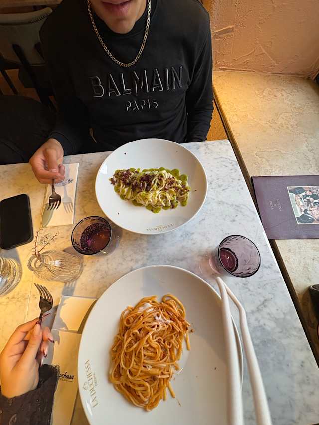 - Linguine con fonduta di parmigiano reggiano DOP 24 Mesi, topping croccante di prosciutto crudo di parma ponte romano DOP 24 mesi, il tutto su una vellutata di zucchine