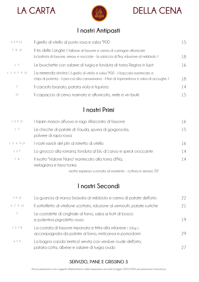 7.5/10There was a slight confusion about the menu card which we were given in English , as apparently 'it was not for this restaurant'? However when we finally ordered, the food came very swiftly. The restaurant got very busy so it took a long time for the plates to be cleared, we were not offered an option of dessert or coffee, and again it took a long time to get the bill. However all in all we enjoyed the cosy atmosphere and delicious food and we would certainly recommend this typical Italian restaurant in the old part of Cirie.