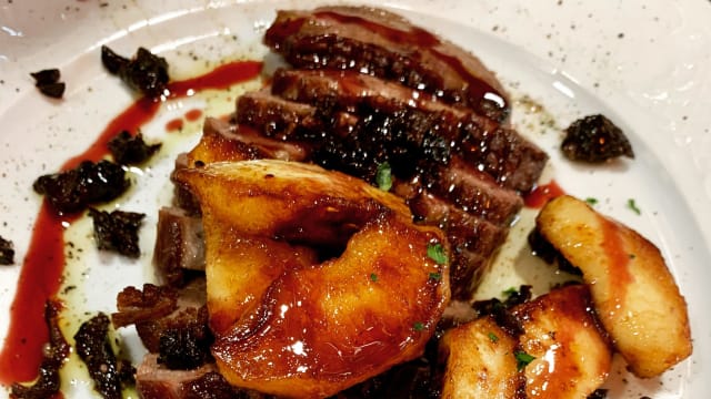 Magret de canard con salsa de ajos dulces y cebolla morada caramelizada