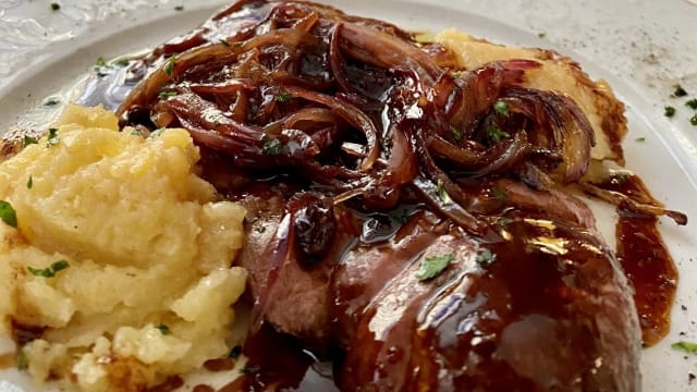 Tiras de foie de boeuf (hígado de ternera) con salsa bourgogne a las hierbas provenzales, cebolla salteada y piñones