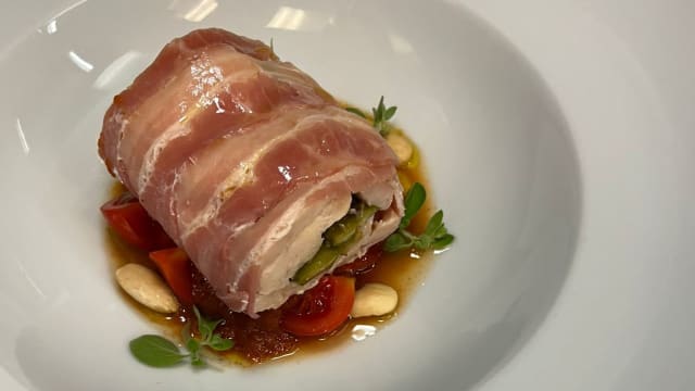 Pomodorino in salsa, bufala campana DOP, cardoncelli e guanciale