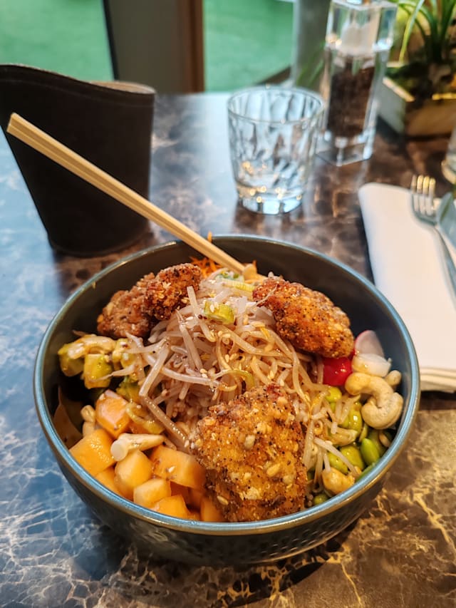 Riz au jasmin, brunoise de concombres, fèves edamames, carottes râpées, ananas et radis sauce soja