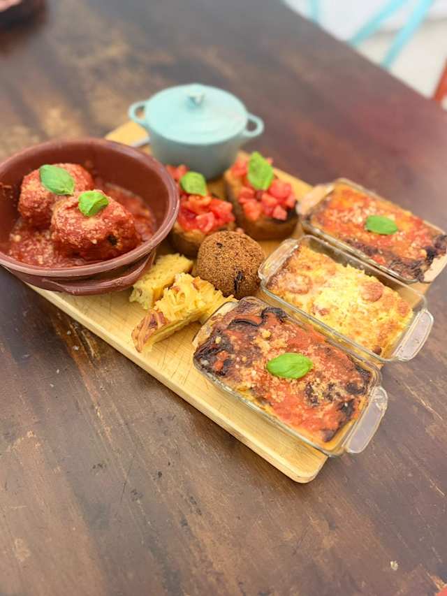 - Parmigiana di melanzane, polpettine al suco, bruschette al pomodoro, polpette di verdure, mozzarella di bufala, fagioli messicani