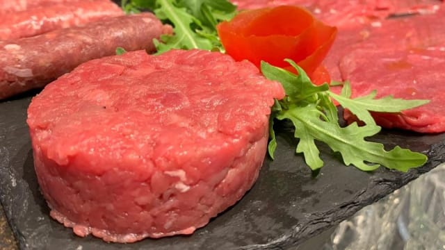 salsiccia cruda di fassona da 130gr, lattuga, pomodoro, fonduta di taleggio