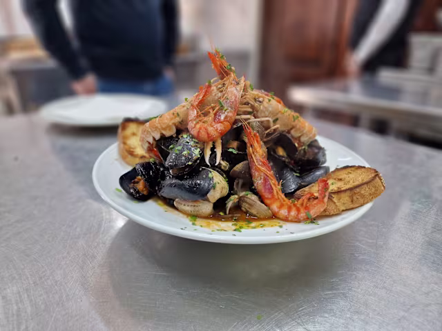 - Cozze, vongole, scampi, gambero rosso e crostoni di pane