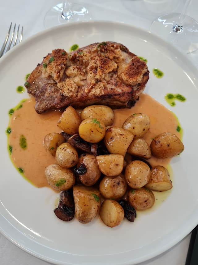 Entrecôte lorraine de 300 grammes, pommes de terre rôties aux oignons rouges, sauce béarnaise
