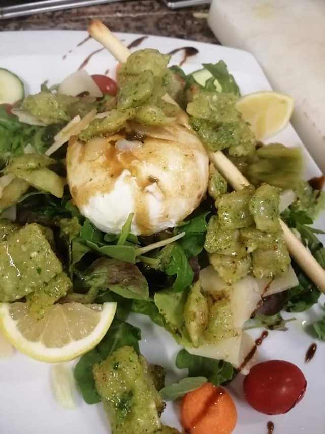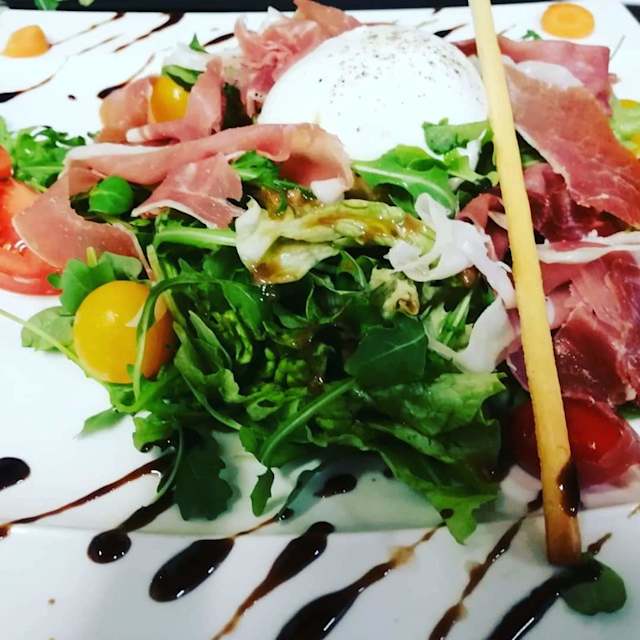 - Tomates, salade verte, fromage italien burrata, roquette, crème balsamique, tomates cerises, jambon sec italien, figue sèche, vinaigrette du chef (huile d'olive, vinaigre balsamique, ail, moutarde et persil frais).