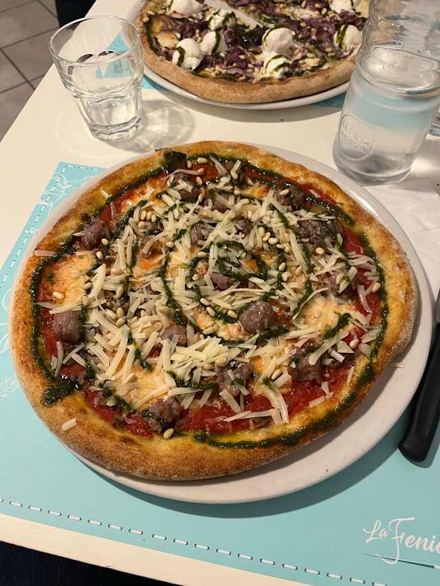 - Fior di latte, salsiccia, crema di melanzane al forno, creama di peperoni al forno ed emulsione al prezemolo