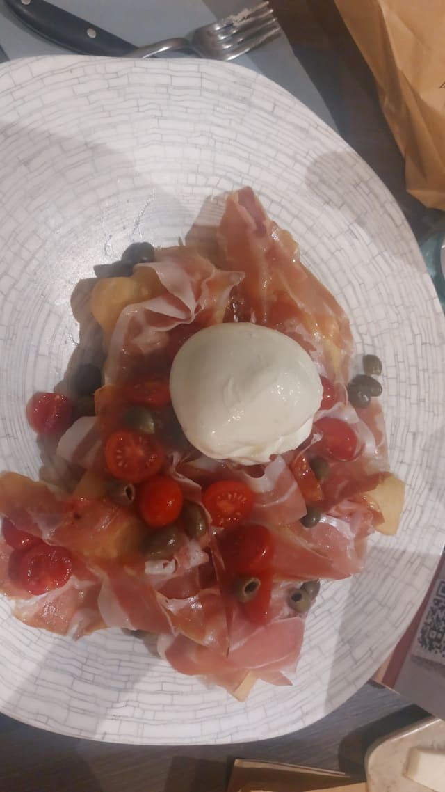 Bufala o burrata, parma, pomodorini, olive, basilico