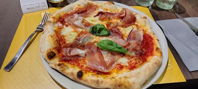 - Pomodoro, bufala, prosciutto crudo, grana fuori cottura, rucola