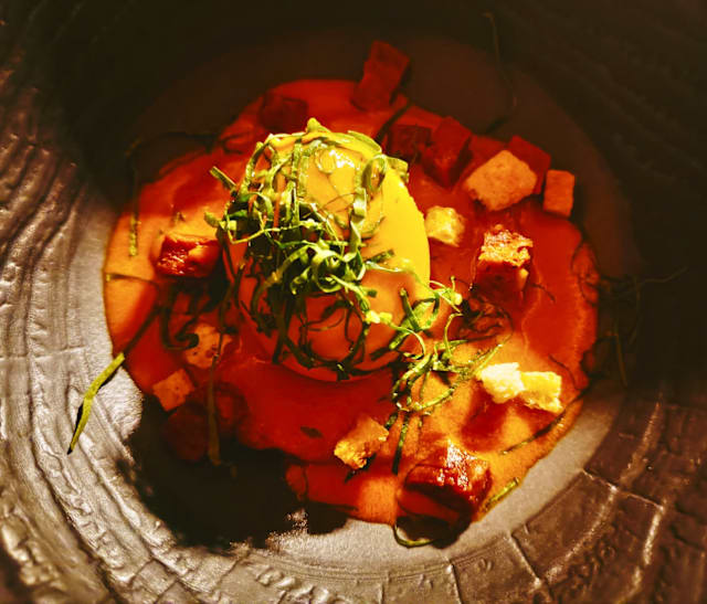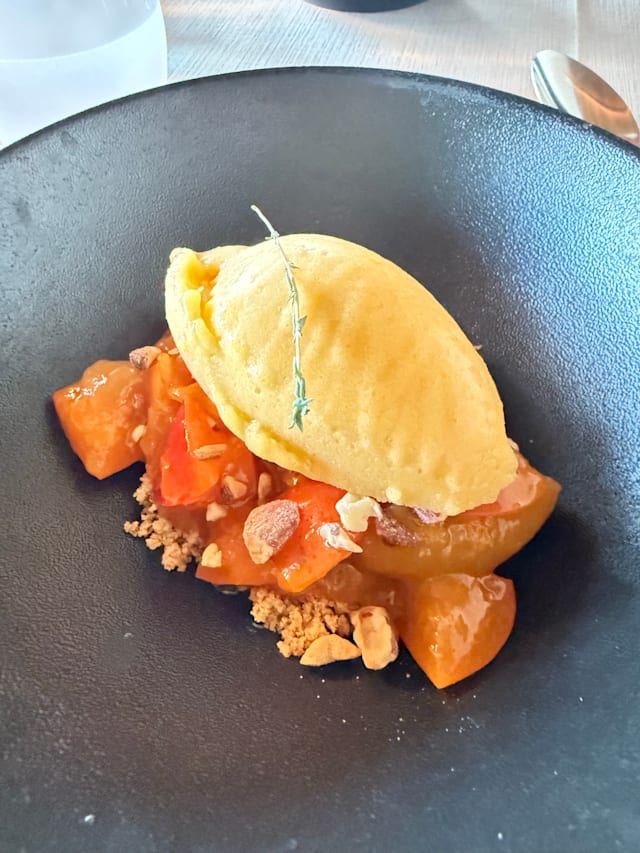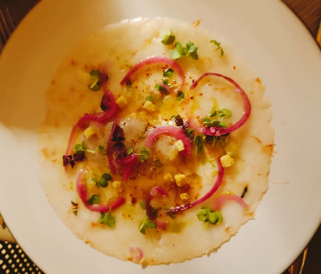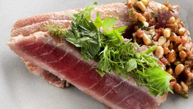 5.5/10Very small and awfully overpriced wine list. We ordered a champagne of over €110, and knowing we are looking at more wine to order for the mains, the sommelier was very(too) fast on pouring the champagne, full glasses and within 15 minutes, the bottle was emptied. Gambas starter was good, fresh and flavored to the point. Tuna from the main was nicely smoked but way too salty. It’s like eating salami as main. Risotto was equally disappointing, more like a congee w cream than risotto. During the meal we were onto 2nd bottle and of course no more luxury of having the service so we were pouring ourselves. I waited to see if anyone coming to pour the wine, not that I have to have the service but when I’m paying 4 times the price, I do expect the service. the waiter literally walked pass by asking the neighboring tables if anything is needed, ignoring our table to avoid taking the bottle from my hand Deserts: apricot cake, dark chocolate mousse both have fake flavoring taste
