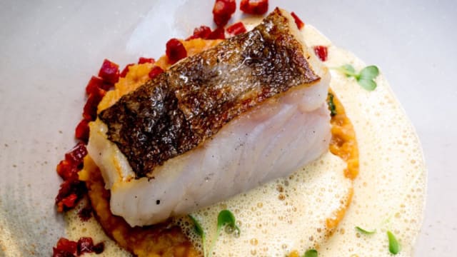 Dos de cabillaud, risotto façon paëlla,sauce chorizo