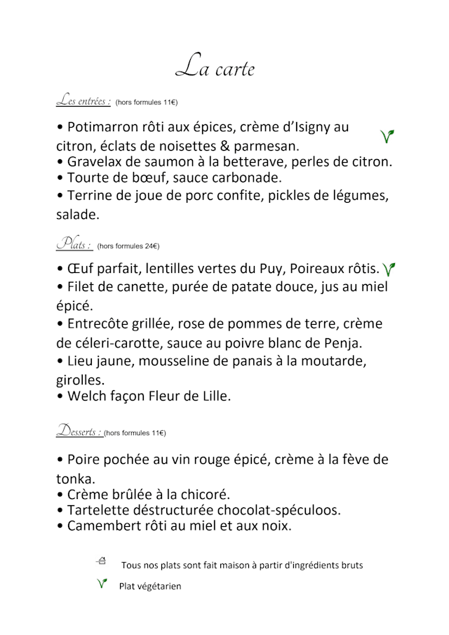 10/10We normally find French cuisine very buttery, but not here! We had a fantastic 3 course meal (starter, main, dessert) and everything was perfectly balanced and well presented. The staff is pivotal in making the right choices from the menu too. Top tip: order everything at the beginning as they only use fresh products and once smtg is no longer available, there is nothing to do apart from choosing smtg else.