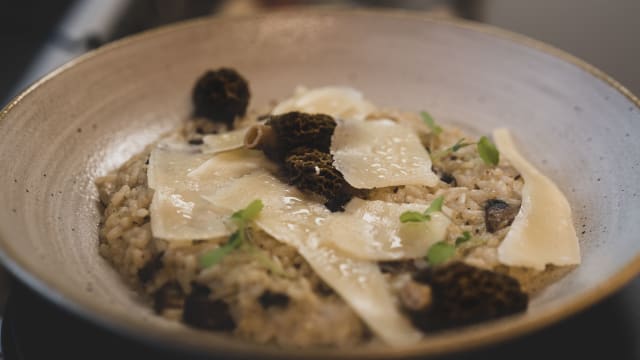Crème de truffe au vieux parmesan, champignons sauvages «cèpes, girolles, trompettes de la mort, morilles» burrata après cuisson, éclats de pistache, lamelles de truffe