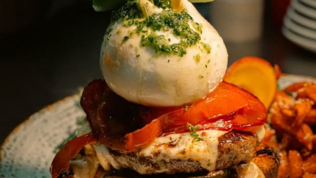 Focaccia toastée, steak de boeuf 180gr, tomates, oignons confits, coppa de boeuf, burrata coulante accompagné de frites de patates douces saupoudré de parmesan