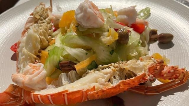 (gambero rosso mazara del vallo, scampi irlandesi, salmone a concassè e ostrica con emulsione di olio limone e pepe verde )