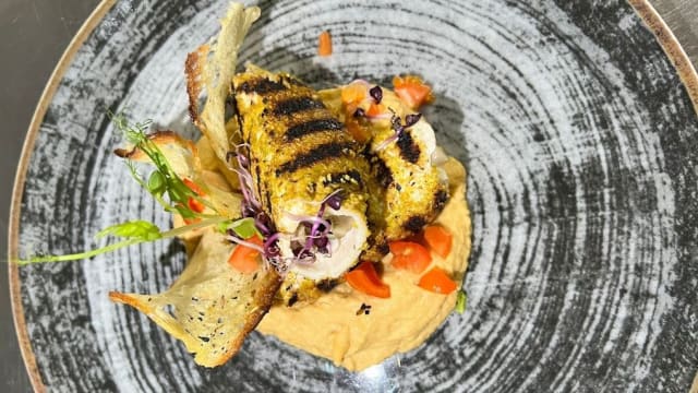 (cotta sulla pelle va servita su humus di ceci con alghe marine e pomodorini)