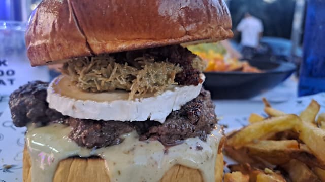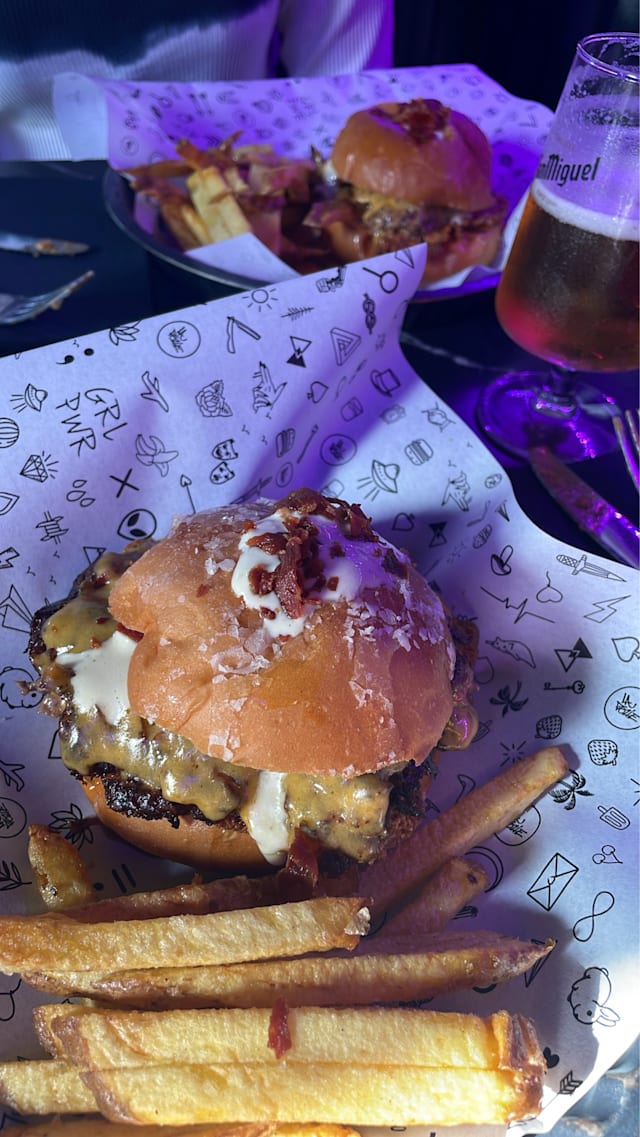 Pan brioche, carne de vaca dry aged, queso americano, cebolla caramelizada, salsa de foie, sésamo y torrezno ahumado