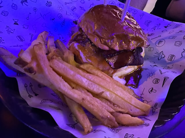 Pan brioche, carne de vaca dry aged, queso cheddar ahumado, queso gouda, bachon thin, pull pork a baja temperatura, salsa bbq de mamá acompañado de bugle lays 3 d.