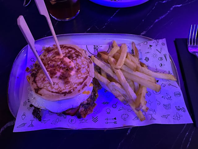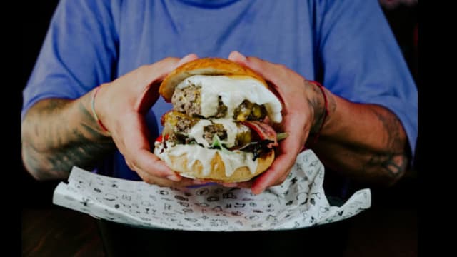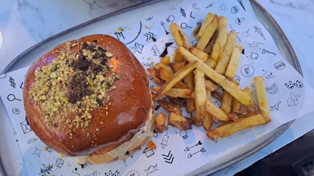 Pan brioche, carne de vaca dry aged, lingote de foie, queso gouda, cebolla caramelizada, kimchi y crema de turrón.