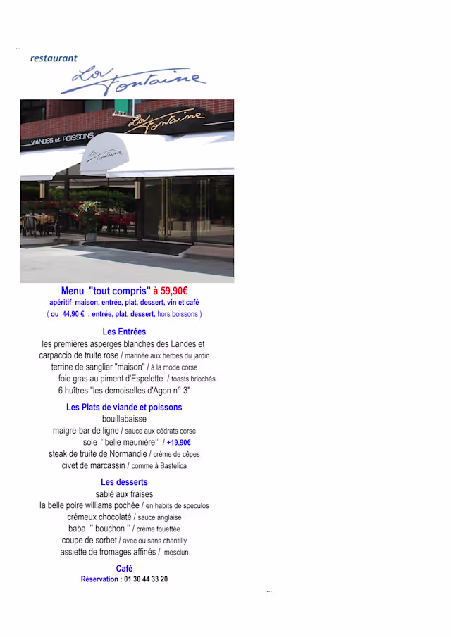 It was a lovely meal in a true French restaurant, the service and quality of food were excellent. Visited restaurant during the Tous a restaurant campaign, were grateful to be able to discover new places not far from Paris that serve delicious food in accordance with high standards of French traditional cuisine. La Fontaine deserves well its badge of honour given by by College Culinaire de France. Merci!