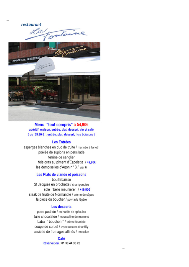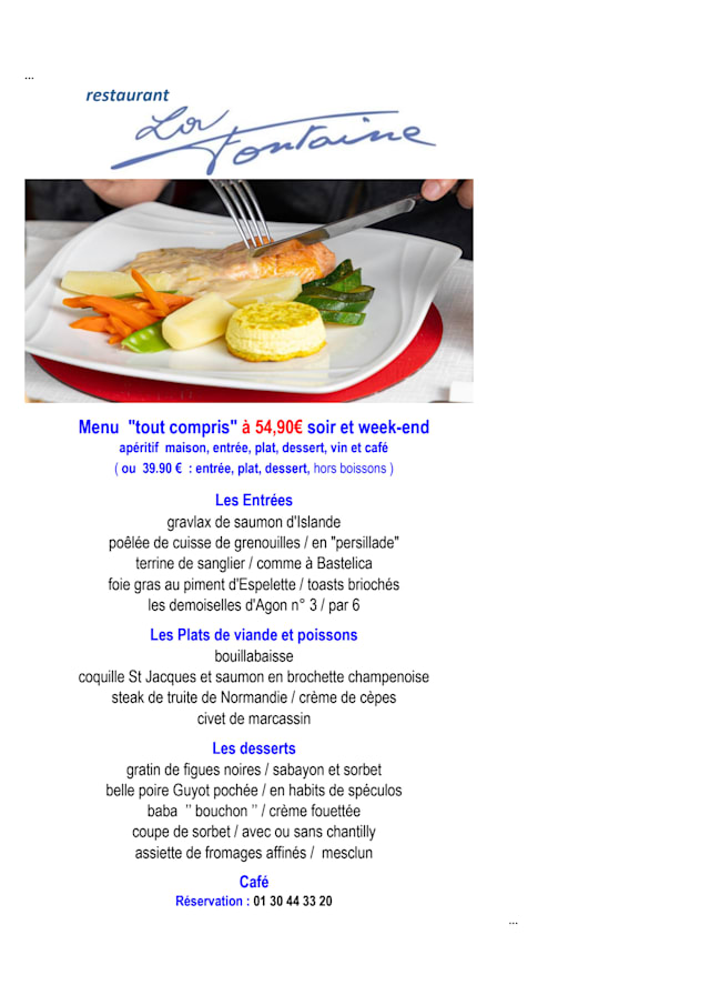 10/10It was a lovely meal in a true French restaurant, the service and quality of food were excellent. Visited restaurant during the Tous a restaurant campaign, were grateful to be able to discover new places not far from Paris that serve delicious food in accordance with high standards of French traditional cuisine. La Fontaine deserves well its badge of honour given by by College Culinaire de France. Merci!