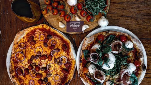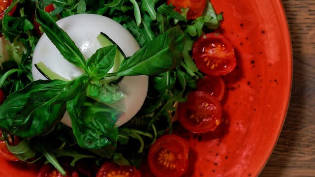 sauce tomates, mozarella di fiori di latte, tomates cerises, aubergine, basilici frais, burrata