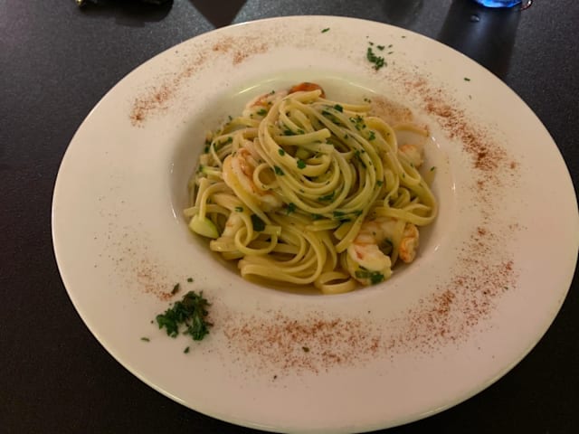 Pasta larga salteada con vieiras, gambitas peladas, ralladura de limón, mantequilla, aceite de trufa y salsa mery pasta fresca y casera