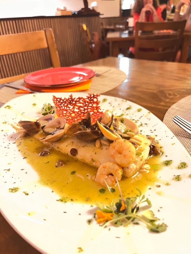 Lenguado acompañado de almejas y gambitas peladas, bañado en una bisque de marisco con pasas y almendras