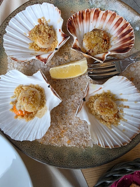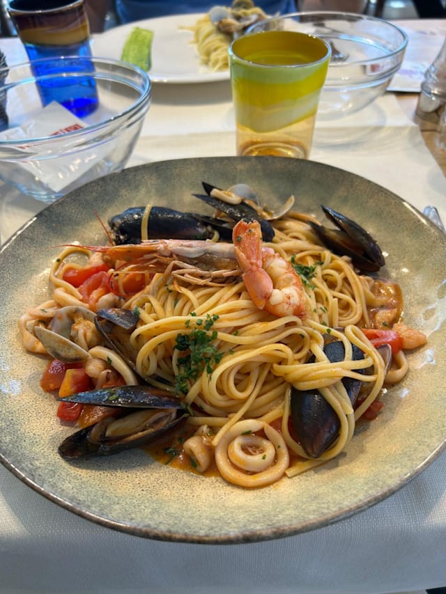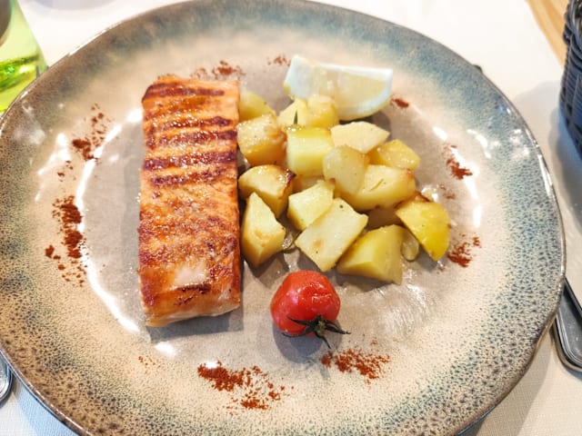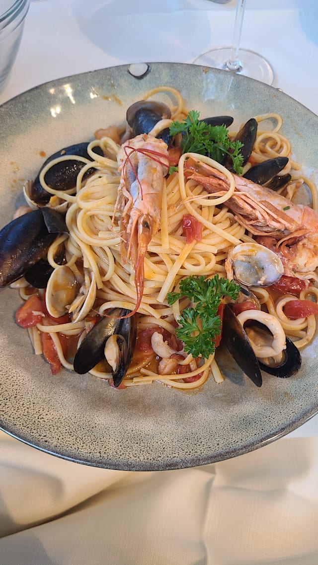 2.5/10We had a reservation with one hour before the kitchen closed. They would not let us sit outside because the available table outside was a four person even though there were plenty of open big tables inside. The scallops were extremely salty and fishy and cost 20 euro for 4 scallops. I then had the ravioli that had no taste beyond salt and only had 5 pieces of ravioli. My husband had the fish platter which was huge, but was pure grease. The bathrooms were filthy, pee on the toilet seats and toilet paper on the floor. The service was very slow and impersonal. The only good thing was the yummy lemon drink they gave us for free at the end. Would not recommend!!