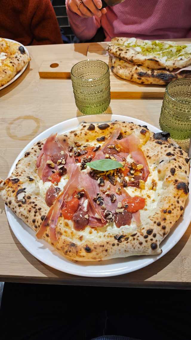 - Pizza demi ouverte, mozza, jambon de parme, roquette, tomates cerises, copeaux de parmesan