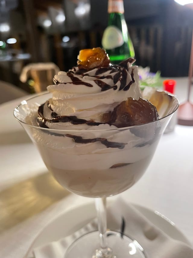 Con funghi finferli, levistico, caviale, gelato alle nocciole