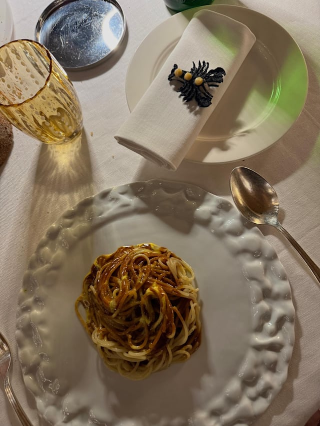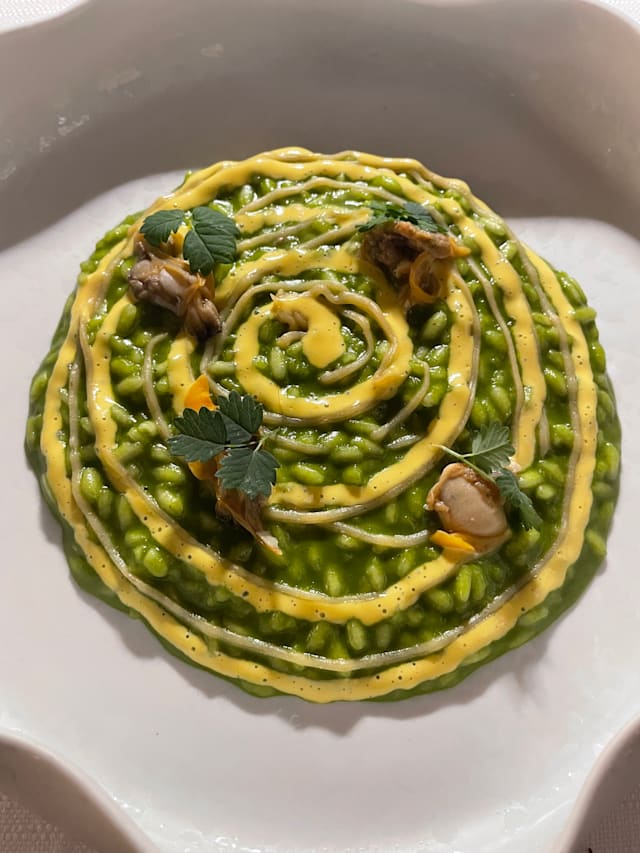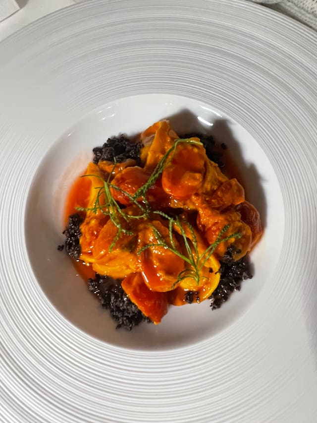 Cotti in brodo di pesce, con tartare di scampi e salsa allo zafferano
