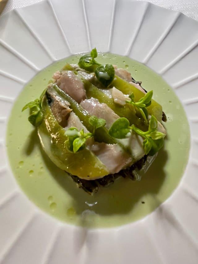 Sgombro marinato e affumicato, servito con cetriolo in osmosi, salsa allo yogurt greco e succo di cetriolo e fagiolini bruciati