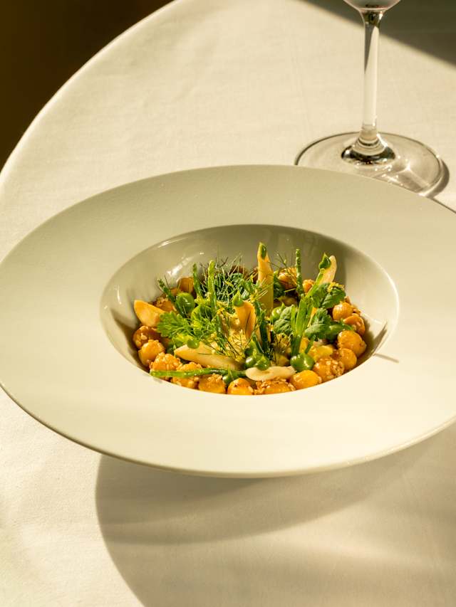 - Egg plin stuffed with slow-cooked duck breast, served in duck-leg consommé with wild blueberries