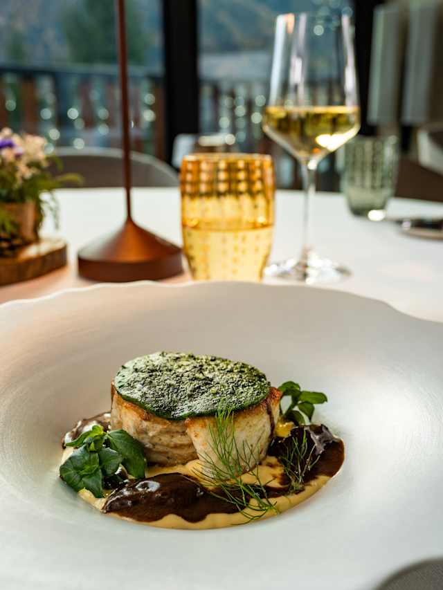 - Turbot fillet cooked in butter, parsley crust, morels stuffed with champignon duxelles, turbot fins and fish-broth emulsion sauce